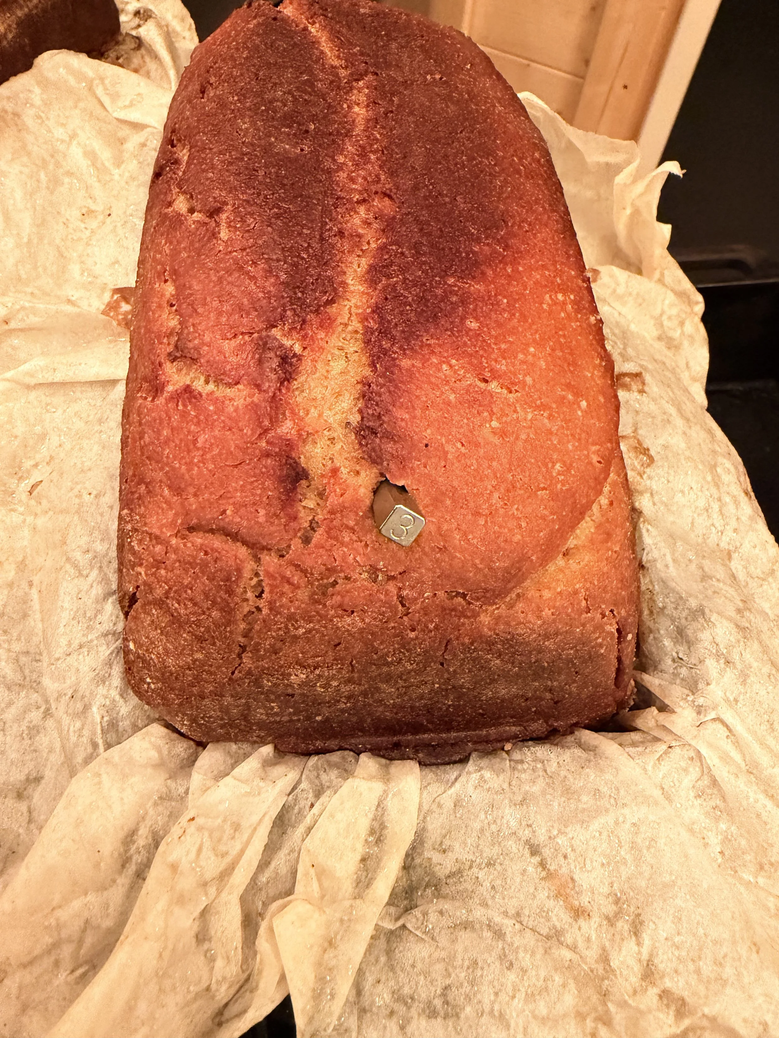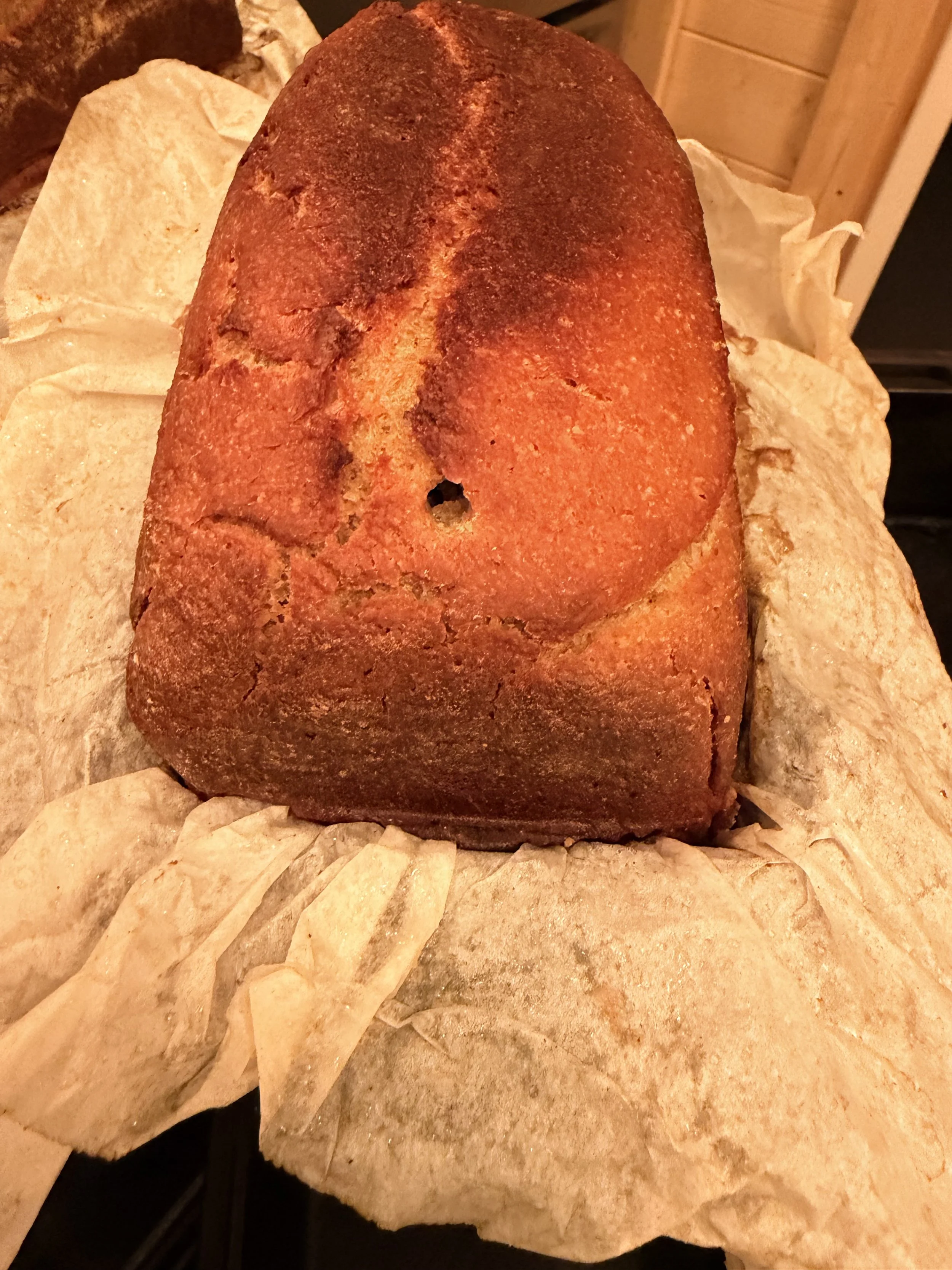 I use a thermometer to check the bread in the oven. When I remove it, it leaves the hole.