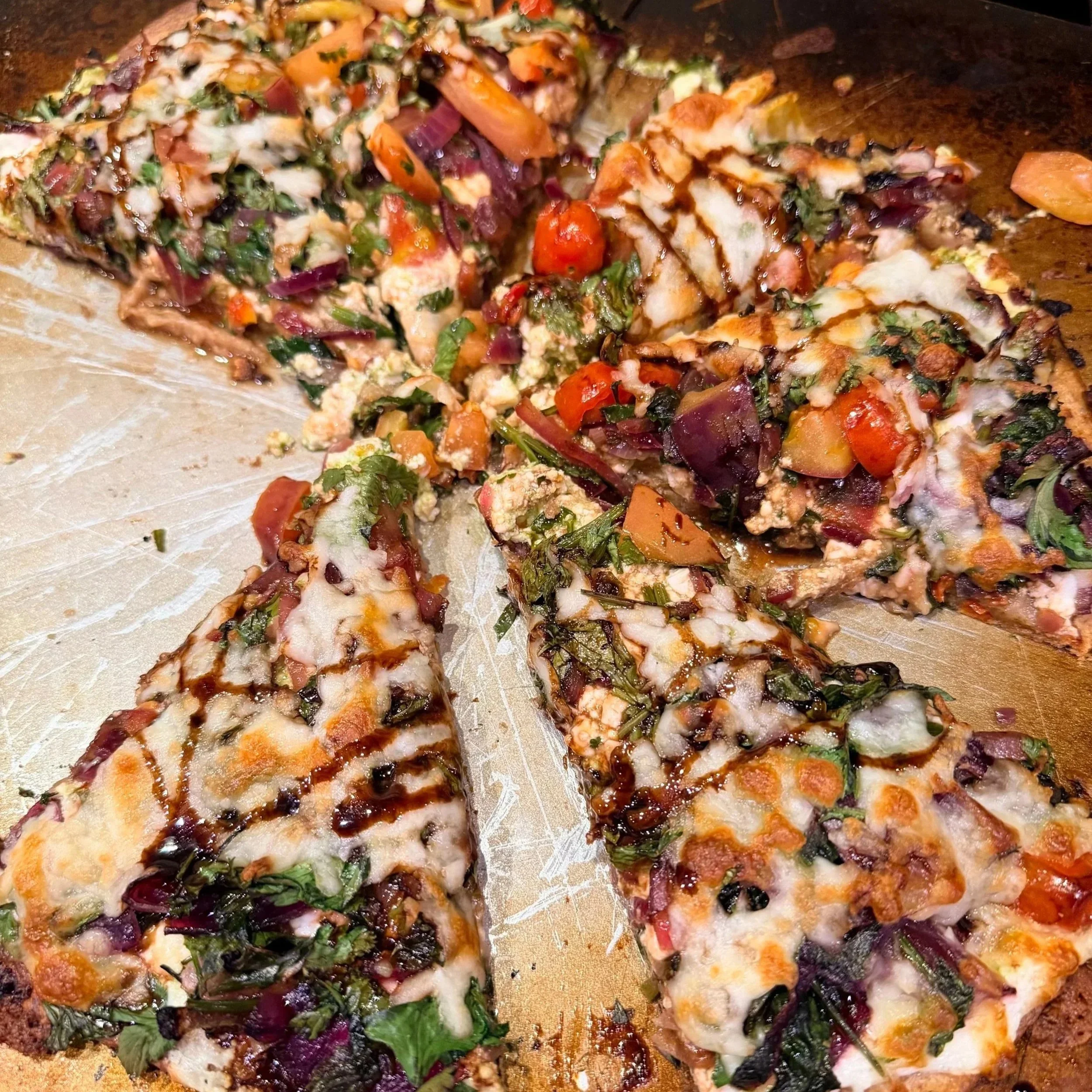 Made with 5 organic cheeses, grilled onions, cilantro, arugula, sun dried tomatoes, ghee, and drizzled w a balsamic reduction sauce.